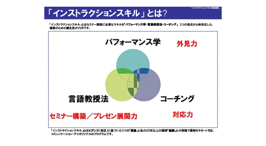 「インストラクションスキル」はエビデンス(実証)に基づいた3つの「理論」(パフォーマンス学、言語教授法、コーチング)と、私の20年以上の講師「経験」との両輪で講師をサポートする、コミュニケーション・アイオリジナルのプログラムです。